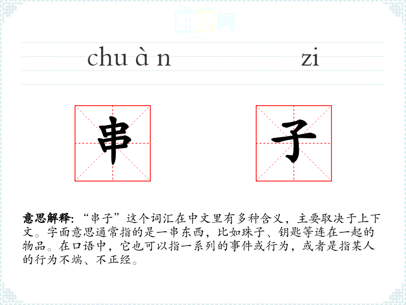 - 口语:在日常对话中,“串子”可能用来形容某人的行为不规矩,如“他是个串子,总是惹是生非”。