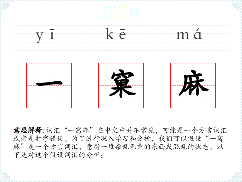 词汇“一窝麻”在中文中并不常见,可能是一个方言词汇或者是打字错误。为了进行深入学习和分析,我们可以假设“一窝麻”是一个方言词汇,意指一堆杂乱无章的东西或混乱的状态。以下是对这个假设词汇的分析: