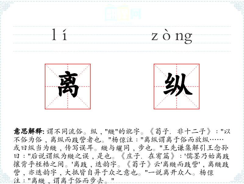 谓不同流俗。纵﹐"縰"的讹字。《荀子.非十二子》﹕"以不俗为俗﹐离纵而跂訾者也。"杨倞注﹕"离纵谓离于俗而放纵……或曰纵当为縰﹐传写误耳。縰与纚同﹐步也。"王先谦集解引王念孙曰﹕"后说谓纵为縰之误﹐是也。《庄子.在宥篇》﹕'儒墨乃始离跂攘背乎桎梏之间。'离跂﹐迭韵字。《荀子》云'离縰而跂訾'﹐离縰跂訾﹐亦迭韵字﹐大抵皆自异于众之意也。"一说离开众人。杨倞注﹕"离縰﹐谓离于俗而步去。"