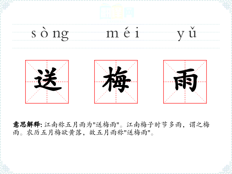 江南称五月雨为"送梅雨"。江南梅子时节多雨,谓之梅雨。农历五月梅欲黄落,故五月雨称"送梅雨"。