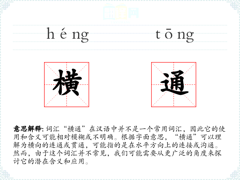 词汇“横通”在汉语中并不是一个常用词汇,因此它的使用和含义可能相对模糊或不明确。根据字面意思,“横通”可以理解为横向的连通或贯通,可能指的是在水平方向上的连接或沟通。然而,由于这个词汇并不常见,我们可能需要从更广泛的角度来探讨它的潜在含义和应用。