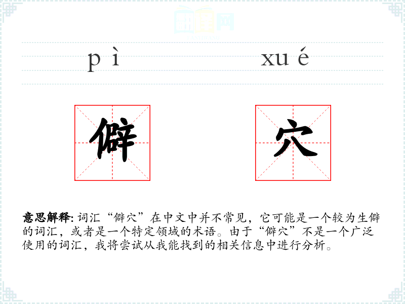 词汇“僻穴”在中文中并不常见,它可能是一个较为生僻的词汇,或者是一个特定领域的术语。由于“僻穴”不是一个广泛使用的词汇,我将尝试从我能找到的相关信息中进行分析。