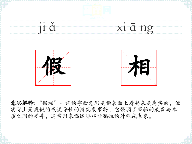“假相”一词的字面意思是指表面上看起来是真实的,但实际上是虚假的或误导性的情况或事物。它强调了事物的表象与本质之间的差异,通常用来描述那些欺骗性的外观或表象。