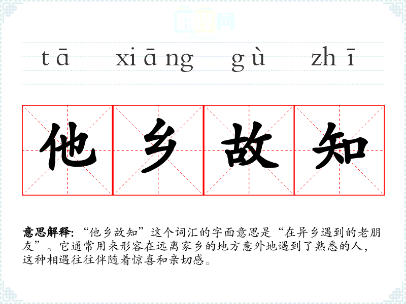 “他乡故知”这个词汇的字面意思是“在异乡遇到的老朋友”。它通常用来形容在远离家乡的地方意外地遇到了熟悉的人,这种相遇往往伴随着惊喜和亲切感。
