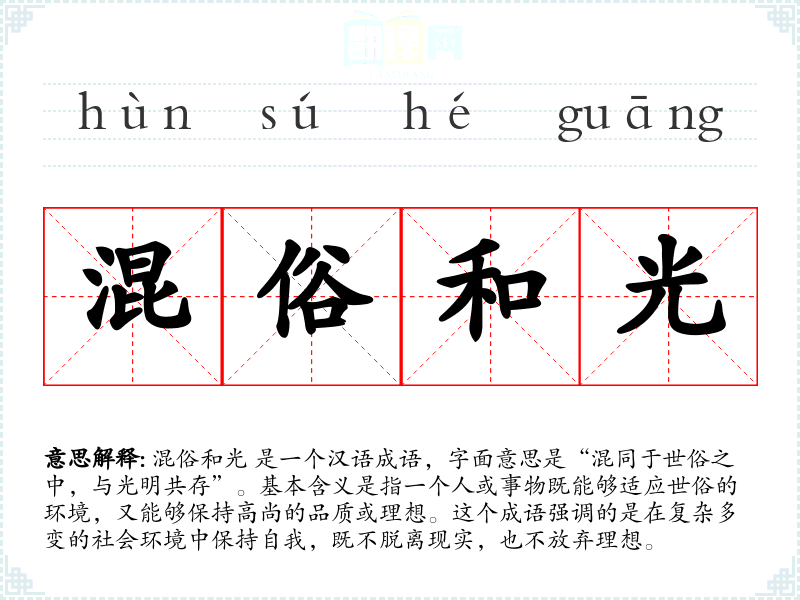 混俗和光 是一个汉语成语,字面意思是“混同于世俗之中,与光明共存”。基本含义是指一个人或事物既能够适应世俗的环境,又能够保持高尚的品质或理想。这个成语强调的是在复杂多变的社会环境中保持自我,既不脱离现实,也不放弃理想。