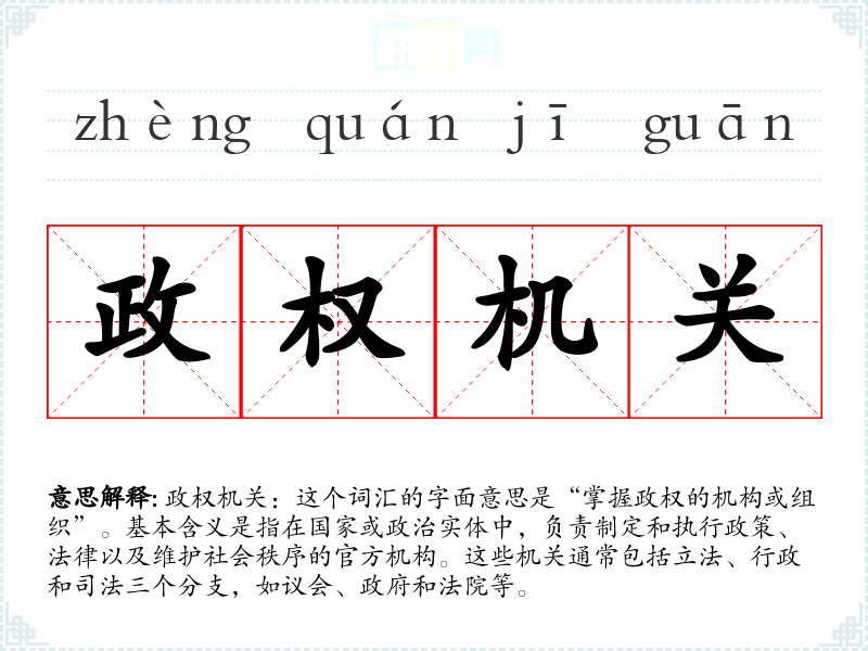 政权机关:这个词汇的字面意思是“掌握政权的机构或组织”。基本含义是指在国家或政治实体中,负责制定和执行政策、法律以及维护社会秩序的官方机构。这些机关通常包括立法、行政和司法三个分支,如议会、政府和法院等。