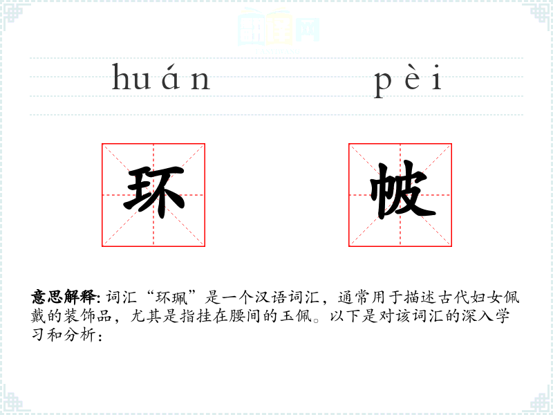 词汇“环珮”是一个汉语词汇,通常用于描述古代妇女佩戴的装饰品,尤其是指挂在腰间的玉佩。以下是对该词汇的深入学*和分析: