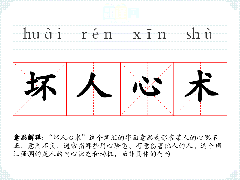 “坏人心术”这个词汇的字面意思是形容某人的心思不正,意图不良,通常指那些用心险恶、有意伤害他人的人。这个词汇强调的是人的内心状态和动机,而非具体的行为。