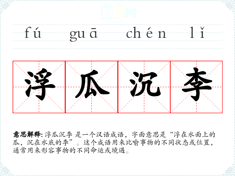 浮瓜沉李 是一个汉语成语,字面意思是“浮在水面上的瓜,沉在水底的李”。这个成语用来比喻事物的不同状态或位置,通常用来形容事物的不同命运或境遇。