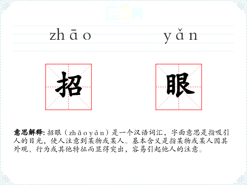招眼(zhāo yǎn)是一个汉语词汇,字面意思是指吸引人的目光,使人注意到某物或某人。基本含义是指某物或某人因其外观、行为或其他特征而显得突出,容易引起他人的注意。
