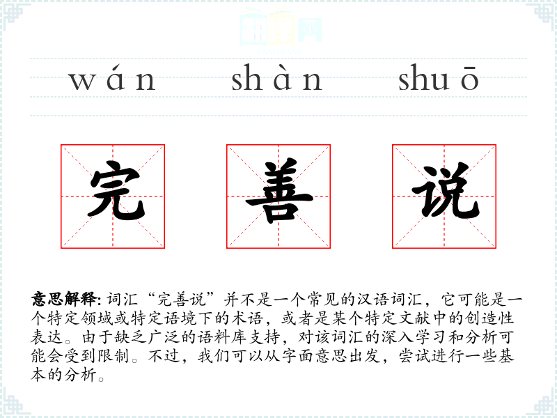词汇“完善说”并不是一个常见的汉语词汇,它可能是一个特定领域或特定语境下的术语,或者是某个特定文献中的创造性表达。由于缺乏广泛的语料库支持,对该词汇的深入学习和分析可能会受到限制。不过,我们可以从字面意思出发,尝试进行一些基本的分析。