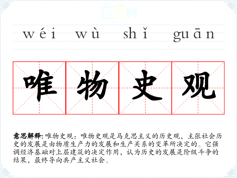 同义词:历史唯物主义(更学术化的表达) 反义词:唯心史观(强调精神、意识形态对历史发展的决定作用)