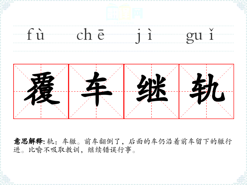 轨:车辙。前车翻倒了,后面的车仍沿着前车留下的辙行进。比喻不吸取教训,继续错误行事。