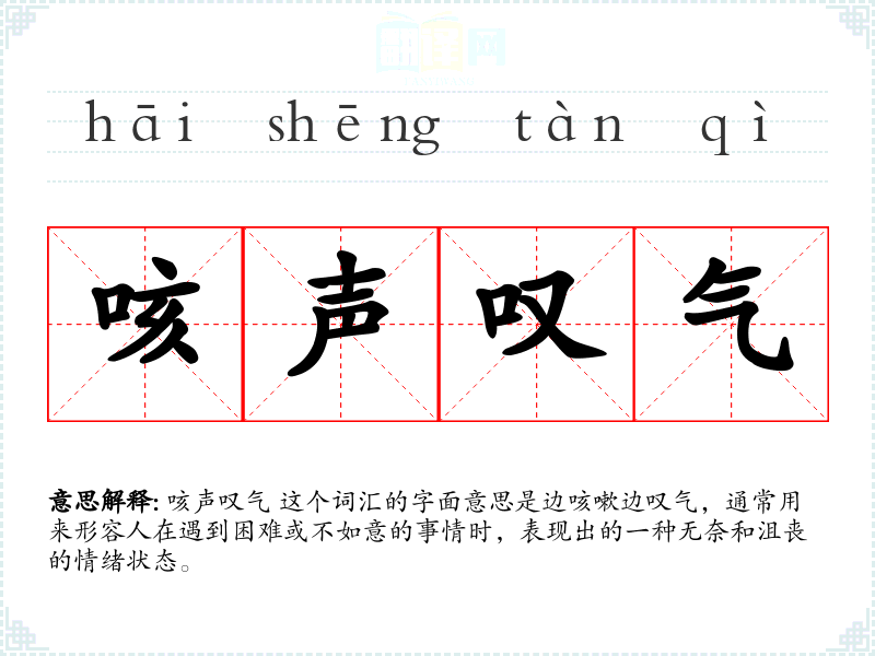 咳声叹气 这个词汇的字面意思是边咳嗽边叹气,通常用来形容人在遇到困难或不如意的事情时,表现出的一种无奈和沮丧的情绪状态。