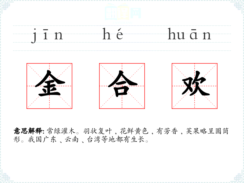 常绿灌木。羽状复叶﹐花鲜黄色﹐有芳香﹐荚果略呈圆筒形。我国广东﹑云南﹑台湾等地都有生长。