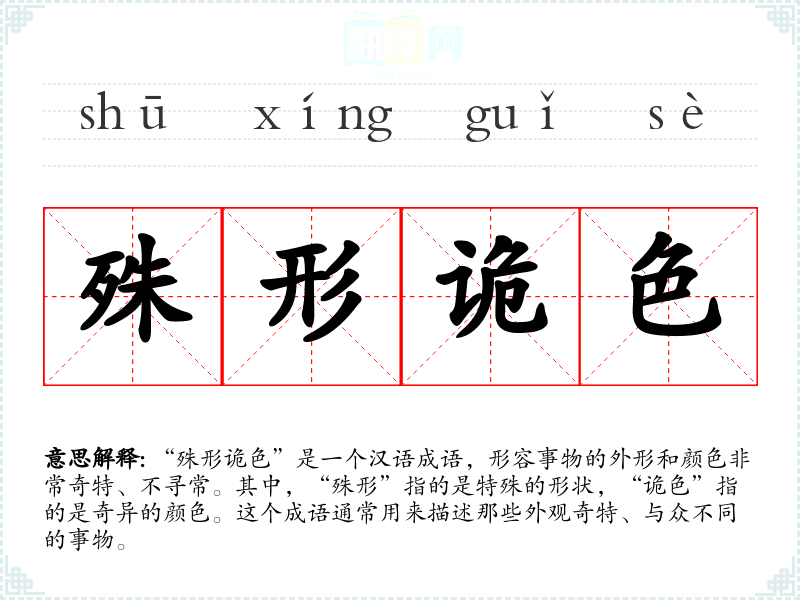 “殊形诡色”这个成语的词源较为明确,由“殊形”和“诡色”两个词组合而成。在古代汉语中,“殊”和“诡”都有“不同寻常”的意思,因此这个成语一直用来形容那些外观奇特的事物。
