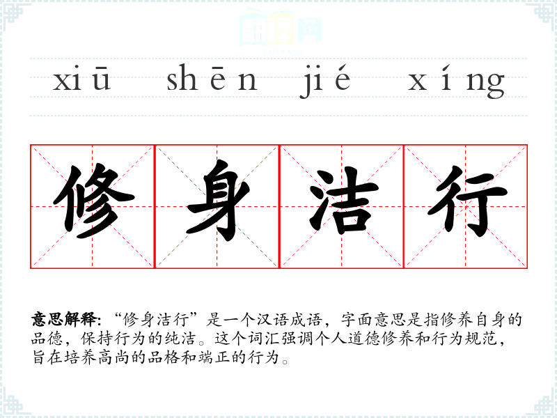 “修身洁行”是一个汉语成语,字面意思是指修养自身的品德,保持行为的纯洁。这个词汇强调个人道德修养和行为规范,旨在培养高尚的品格和端正的行为。