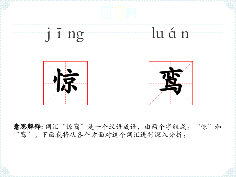 - 理解:“惊鸾”是一个富有文化内涵的成语,虽然在现代使用较少,但在特定的文学和艺术领域仍有其独特的价值。