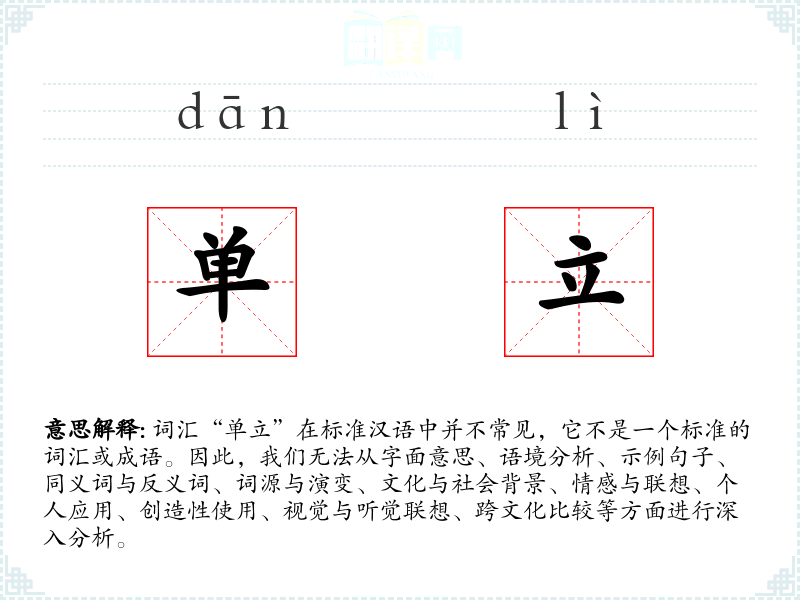 然而,如果我们从“单立”这个词汇的构成来分析,可以推测它可能是由“单”和“立”两个字组合而成。在中文中,“单”通常表示单独、单一的意思,而“立”则表示站立、建立等含义。因此,“单立”可能被理解为“单独站立”或“单一建立”的意思。