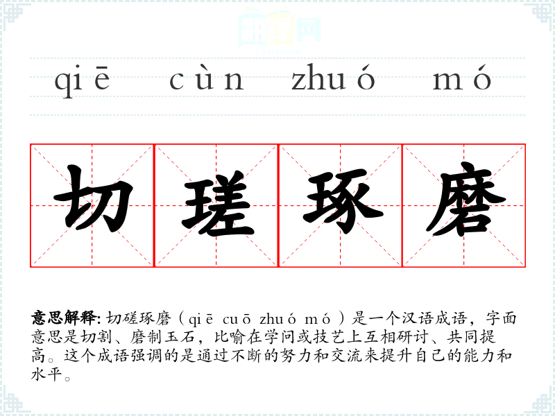 切磋琢磨(qiē cuō zhuó mó)是一个汉语成语,字面意思是切割、磨制玉石,比喻在学问或技艺上互相研讨、共同提高。这个成语强调的是通过不断的努力和交流来提升自己的能力和水平。