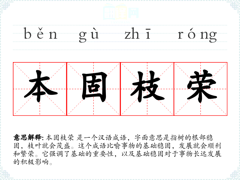 本固枝荣 是一个汉语成语,字面意思是指树的根部稳固,枝叶就会茂盛。这个成语比喻事物的基础稳固,发展就会顺利和繁荣。它强调了基础的重要性,以及基础稳固对于事物长远发展的积极影响。