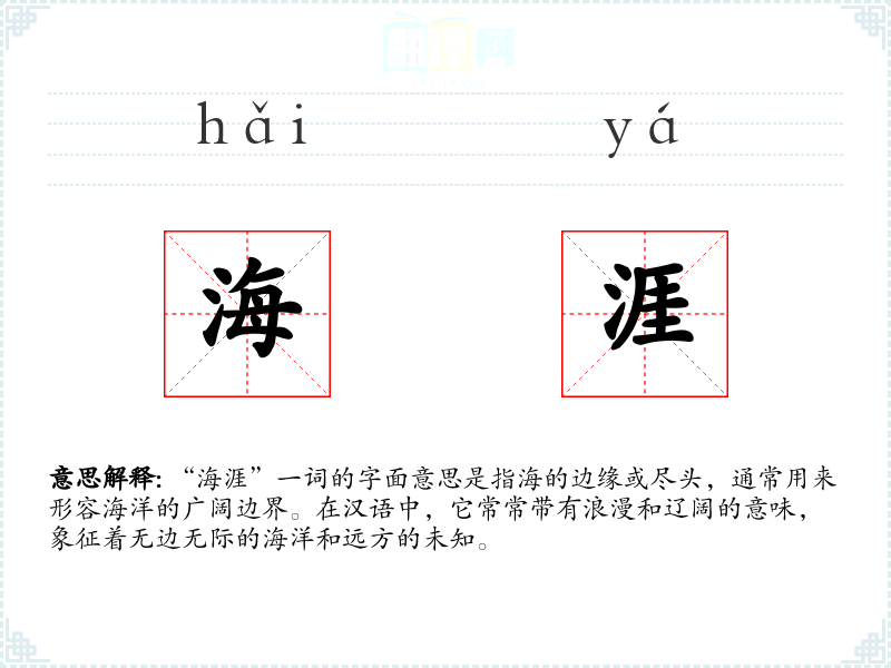 “海涯”一词的字面意思是指海的边缘或尽头,通常用来形容海洋的广阔边界。在汉语中,它常常带有浪漫和辽阔的意味,象征着无边无际的海洋和远方的未知。
