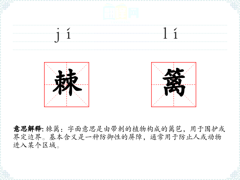 棘篱:字面意思是由带刺的植物构成的篱笆,用于围护或界定边界。基本含义是一种防御性的屏障,通常用于防止人或动物进入某个区域。