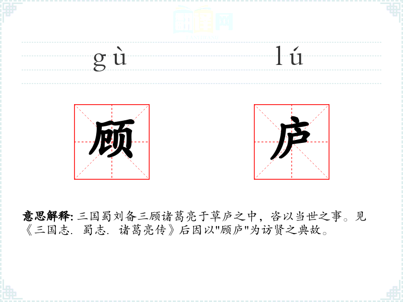 三国蜀刘备三顾诸葛亮于草庐之中,咨以当世之事。见《三国志.蜀志.诸葛亮传》后因以"顾庐"为访贤之典故。