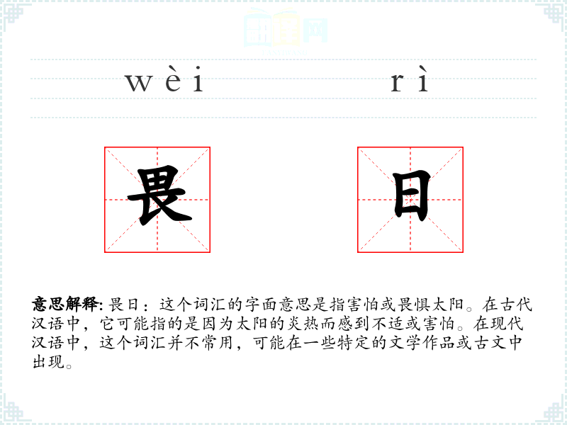 畏日:这个词汇的字面意思是指害怕或畏惧太阳。在古代汉语中,它可能指的是因为太阳的炎热而感到不适或害怕。在现代汉语中,这个词汇并不常用,可能在一些特定的文学作品或古文中出现。