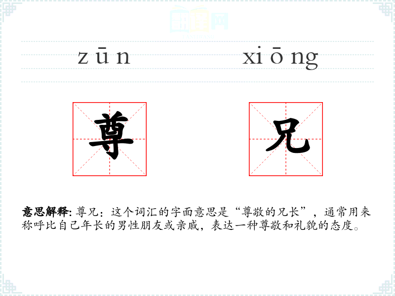 尊兄:这个词汇的字面意思是“尊敬的兄长”,通常用来称呼比自己年长的男性朋友或亲戚,表达一种尊敬和礼貌的态度。