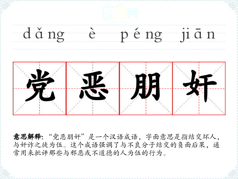 “党恶朋奸”是一个汉语成语,字面意思是指结交坏人,与奸诈之徒为伍。这个成语强调了与不良分子结交的负面后果,通常用来批评那些与邪恶或不道德的人为伍的行为。