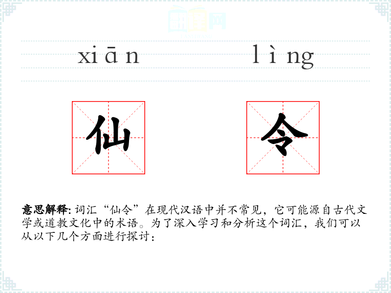 词汇“仙令”在现代汉语中并不常见,它可能源自古代文学或道教文化中的术语。为了深入学*和分析这个词汇,我们可以从以下几个方面进行探讨: