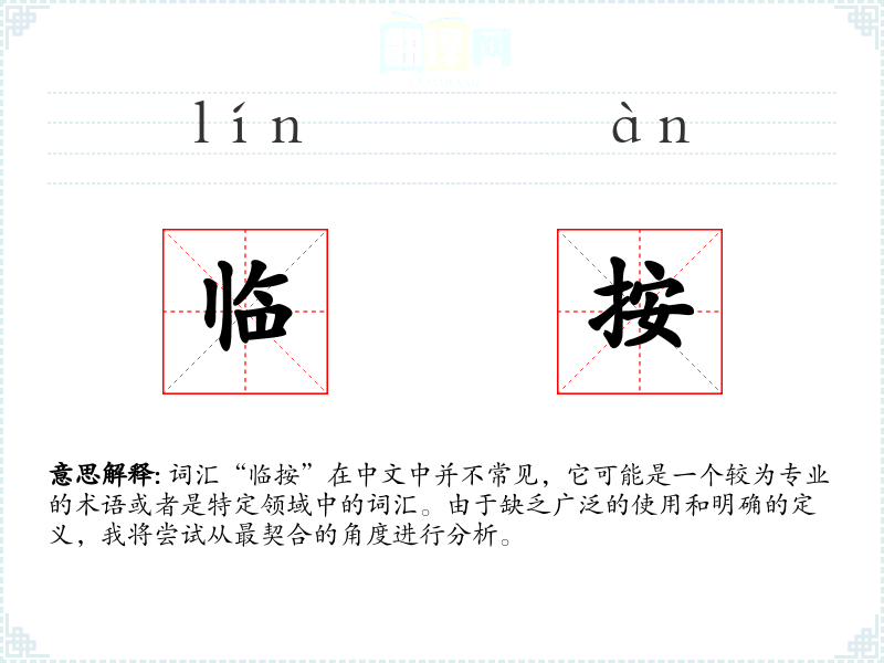 词汇“临按”在中文中并不常见,它可能是一个较为专业的术语或者是特定领域中的词汇。由于缺乏广泛的使用和明确的定义,我将尝试从最契合的角度进行分析。