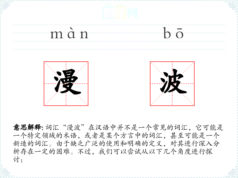 由于“漫波”不是一个标准汉语词汇,我们无法给出一个确切的基本定义。它可能是指某种波动的状态,或者是某个特定领域(如物理学、音乐、艺术等)中的专业术语。