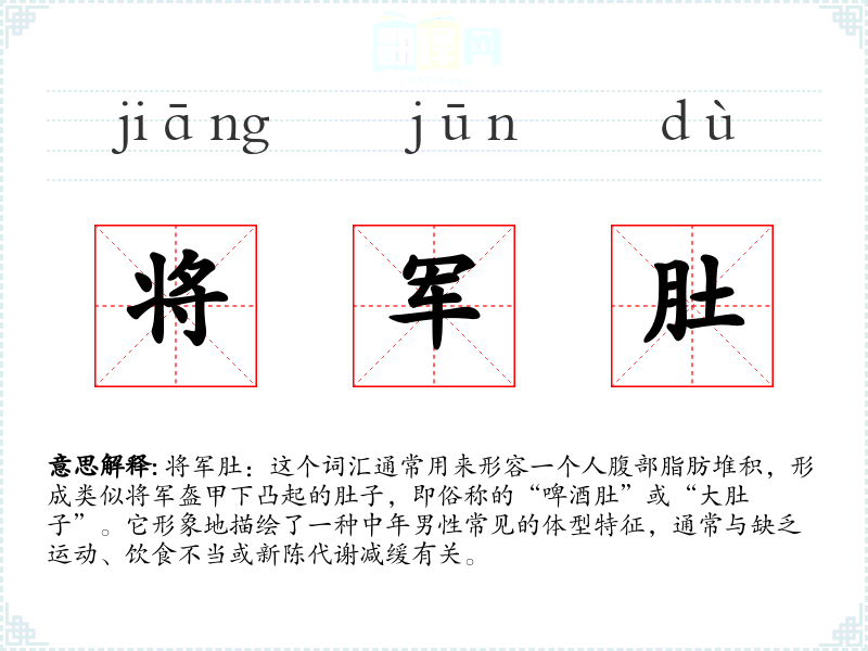 将军肚:这个词汇通常用来形容一个人腹部脂肪堆积,形成类似将军盔甲下凸起的肚子,即俗称的“啤酒肚”或“大肚子”。它形象地描绘了一种中年男性常见的体型特征,通常与缺乏**、饮食不当或新陈代谢减缓有关。