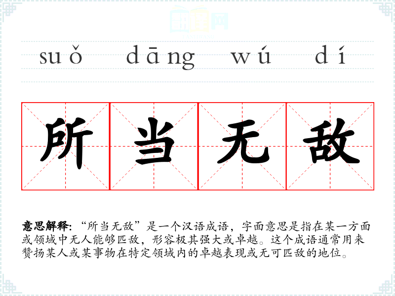 “所当无敌”是一个汉语成语,字面意思是指在某一方面或领域中无人能够匹敌,形容极其强大或卓越。这个成语通常用来赞扬某人或某事物在特定领域内的卓越表现或无可匹敌的地位。
