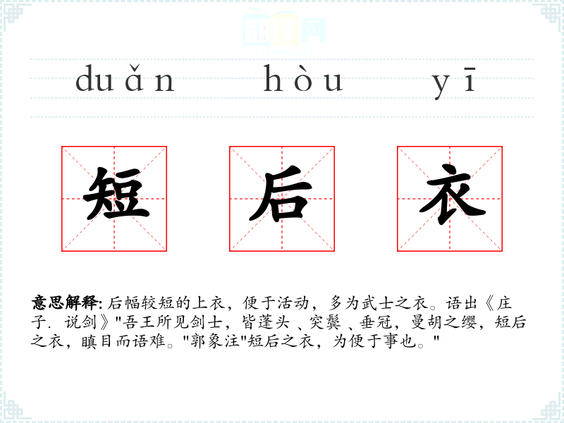 后幅较短的上衣,便于活动,多为武士之衣。语出《庄子.说剑》"吾王所见剑士,皆蓬头﹑突鬓﹑垂冠,曼胡之缨,短后之衣,瞋目而语难。"郭象注"短后之衣,为便于事也。"