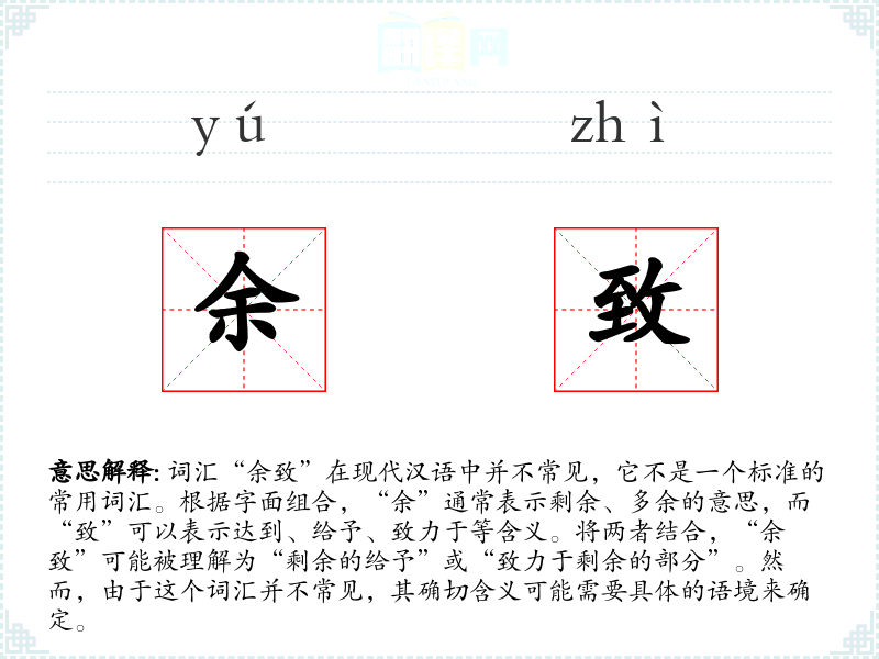 - 字面意思和基本含义:由于“余致”不是一个标准词汇,其字面意思可能是“剩余的给予”或“致力于剩余的部分”,但这仅是一种推测。