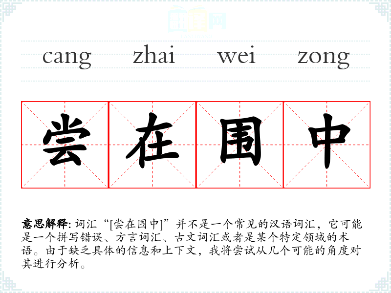词汇“[尝在围中]”并不是一个常见的汉语词汇,它可能是一个拼写错误、方言词汇、古文词汇或者是某个特定领域的术语。由于缺乏具体的信息和上下文,我将尝试从几个可能的角度对其进行分析。