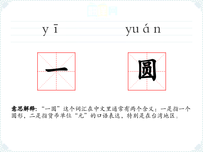 “一圆”这个词汇在中文里通常有两个含义:一是指一个圆形,二是指货币单位“元”的口语表达,特别是在台湾地区。