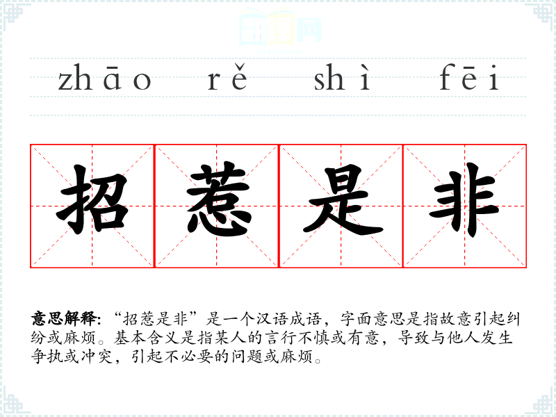 “招惹是非”是一个汉语成语,字面意思是指故意引起纠纷或麻烦。基本含义是指某人的言行不慎或有意,导致与他人发生争执或冲突,引起不必要的问题或麻烦。