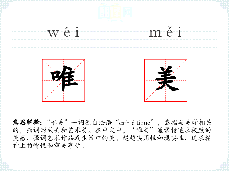 “唯美”一词源自法语“esthétique”,意指与美学相关的,强调形式美和艺术美。在中文中,“唯美”通常指追求极致的美感,强调艺术作品或生活中的美,超越实用性和现实性,追求精神上的愉悦和审美享受。