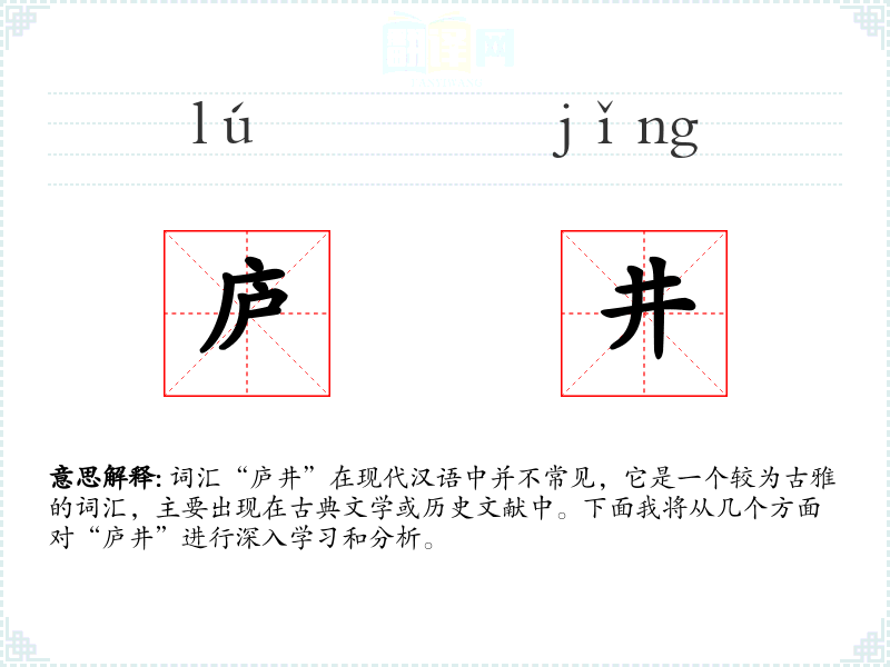 词汇“庐井”在现代汉语中并不常见,它是一个较为古雅的词汇,主要出现在古典文学或历史文献中。下面我将从几个方面对“庐井”进行深入学*和分析。