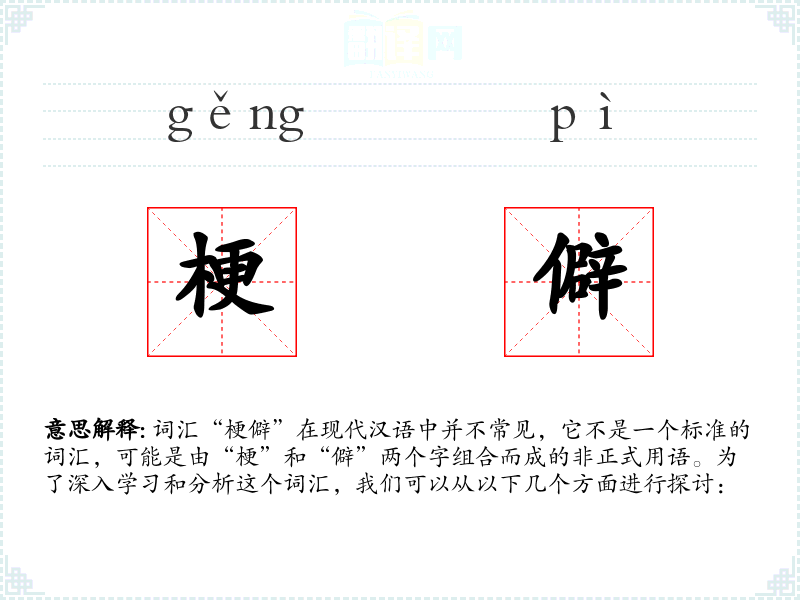 词汇“梗僻”在现代汉语中并不常见,它不是一个标准的词汇,可能是由“梗”和“僻”两个字组合而成的非正式用语。为了深入学习和分析这个词汇,我们可以从以下几个方面进行探讨: