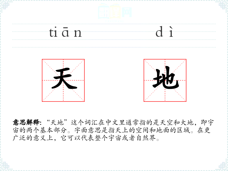 同义词:宇宙、世界、乾坤 反义词:无(因为“天地”通常作为一个整体概念,没有直接的反义词)