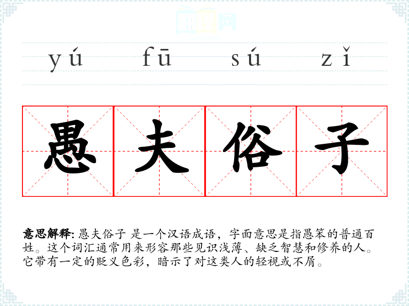 愚夫俗子 这个词汇的词源可以追溯到古代汉语,其中“愚”指的是愚笨,“夫”和“子”都是指人。在古代文学和哲学作品中,这个词汇经常被用来批评那些缺乏教育和修养的人。随着时间的推移,这个词汇的贬义色彩有所减弱,但在现代汉语中仍然带有一定的负面含义。
