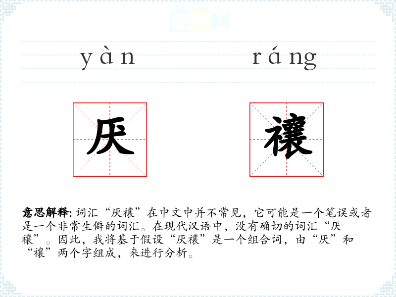 词汇“厌禳”在中文中并不常见,它可能是一个笔误或者是一个非常生僻的词汇。在现代汉语中,没有确切的词汇“厌禳”。因此,我将基于假设“厌禳”是一个组合词,由“厌”和“禳”两个字组成,来进行分析。