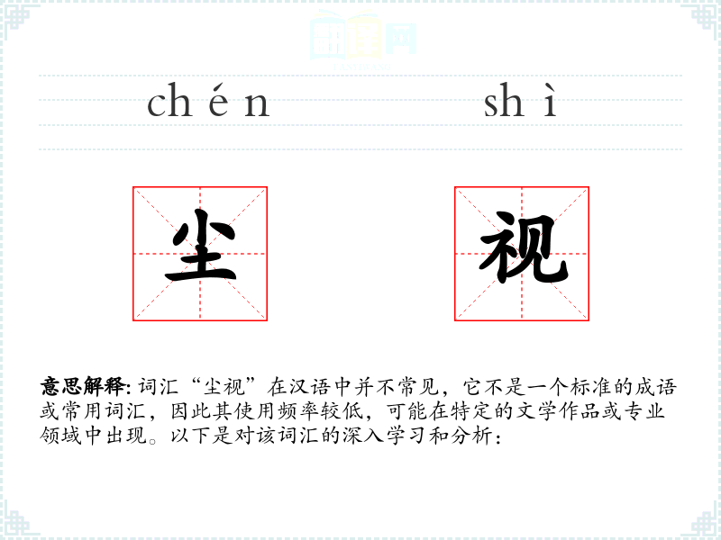 词汇“尘视”在汉语中并不常见,它不是一个标准的成语或常用词汇,因此其使用频率较低,可能在特定的文学作品或专业领域中出现。以下是对该词汇的深入学习和分析: