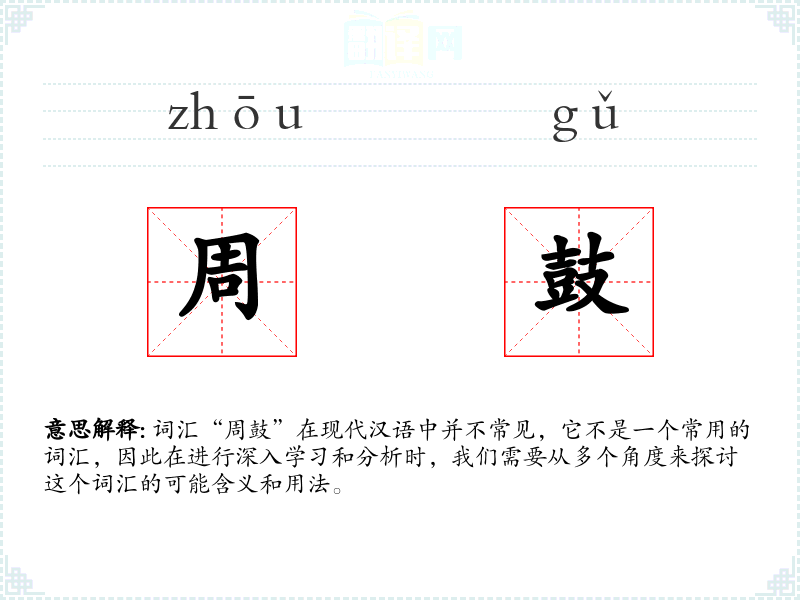 词汇“周鼓”在现代汉语中并不常见,它不是一个常用的词汇,因此在进行深入学*和分析时,我们需要从多个角度来探讨这个词汇的可能含义和用法。