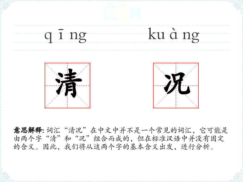 词汇“清况”在中文中并不是一个常见的词汇,它可能是由两个字“清”和“况”组合而成的,但在标准汉语中并没有固定的含义。因此,我们将从这两个字的基本含义出发,进行分析。